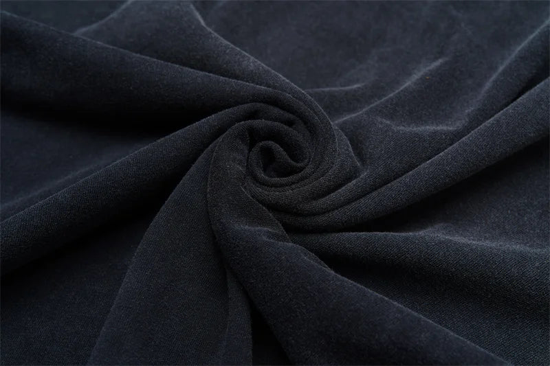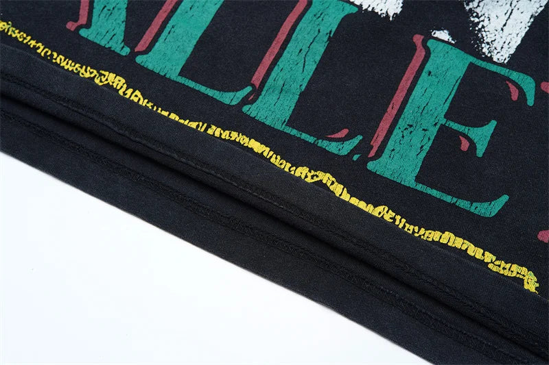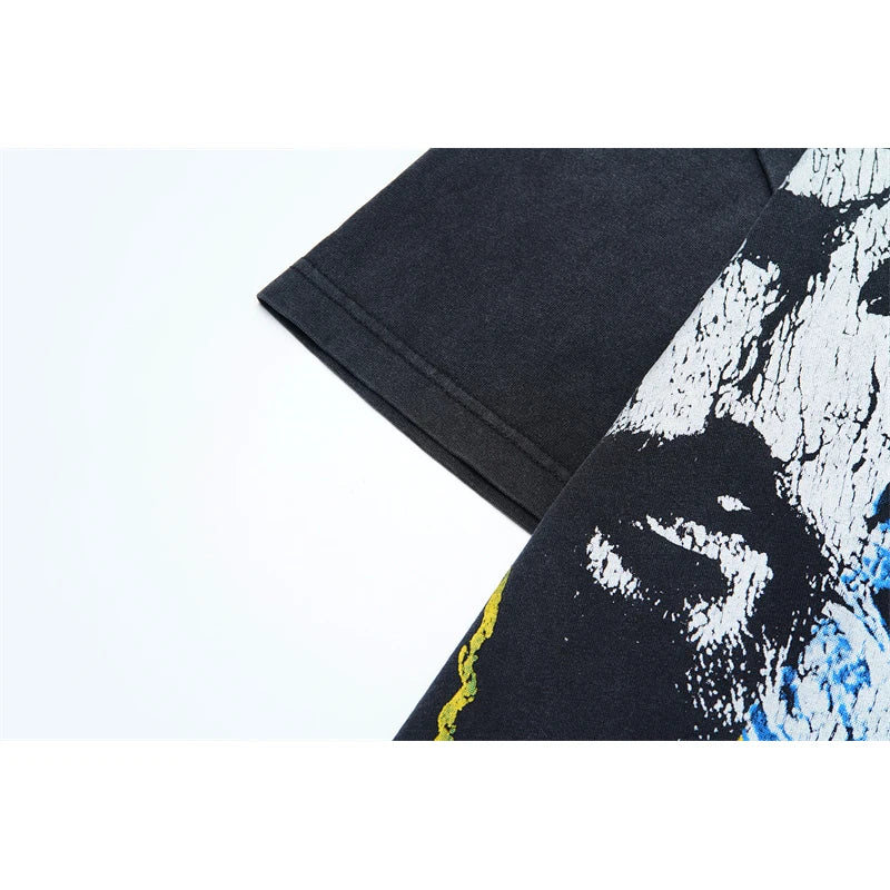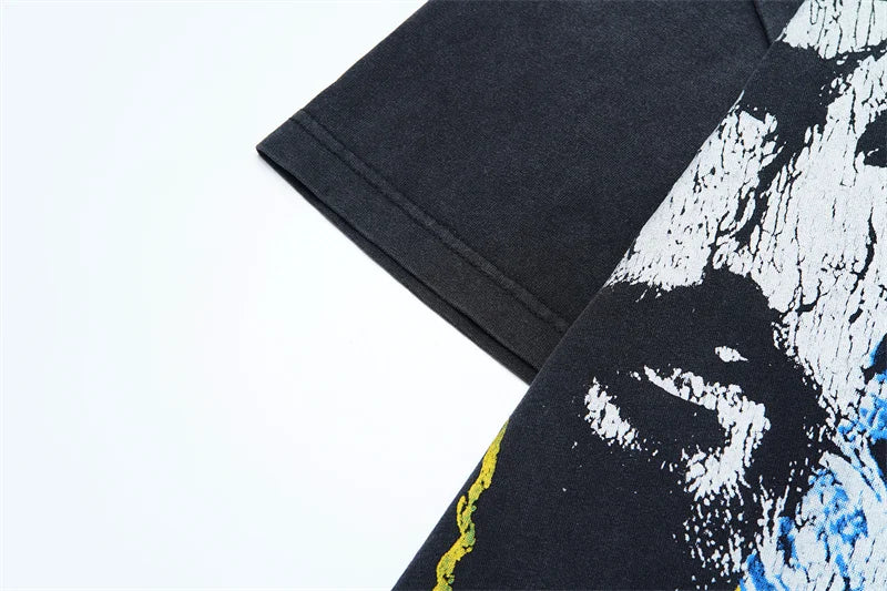 Vale European And American Fashion Pure Cotton Printed Retro Washed Round Neck Black Short Sleeved Shirt